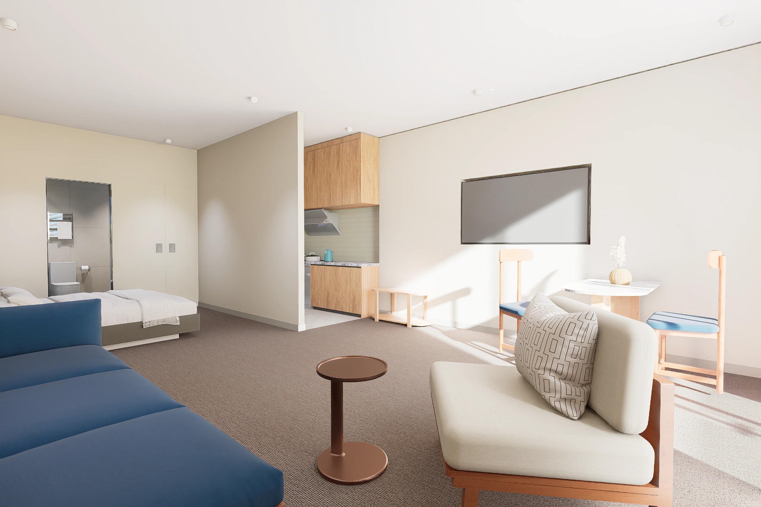 The apartments are designed with efficient layouts and natural light, creating comfortable spaces for both living and remote work. Large windows frame views of the surrounding hills and the distant ocean horizon, bringing the landscape into everyday life. Carefully considered interiors and compact layouts make the homes easy to maintain while remaining comfortable for longer stays.